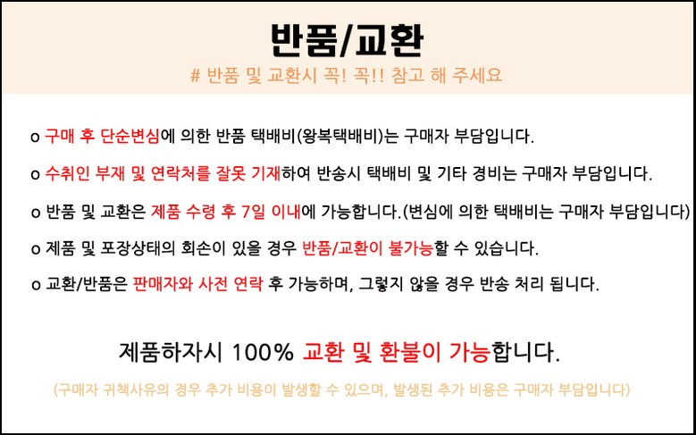 - 색상,사이즈 등 고객 변심 혹은 고객 과실로 인한 제품의 교환/반품을 원하시는 경우, 교환/반품에 소요되는 배송비는 고객이 부담합니다.