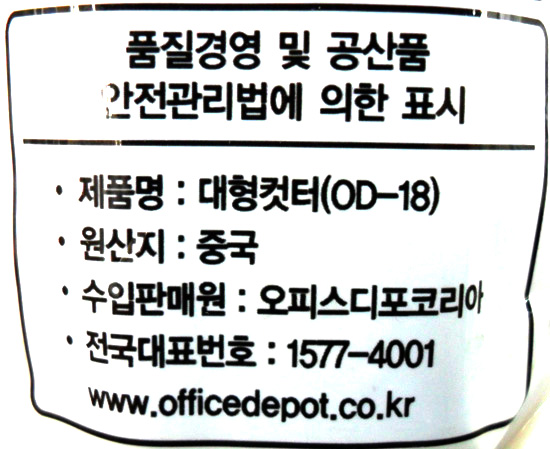 ■ 품명 및 모델명: 컷터(SK-5/OD-18/OfficeDEPOT)■ 법에 의한 인증, 허가 등을 받았음을 확인할 수 있는 경우 그에 대한 사항: 해당없음■ 제조국 또는 원산지: 중국■ 수입여부: ㈜오피스디포 코리아■ 연락처: ㈜오피스디포코리아 / 1899-6800■ 안전인증여부: